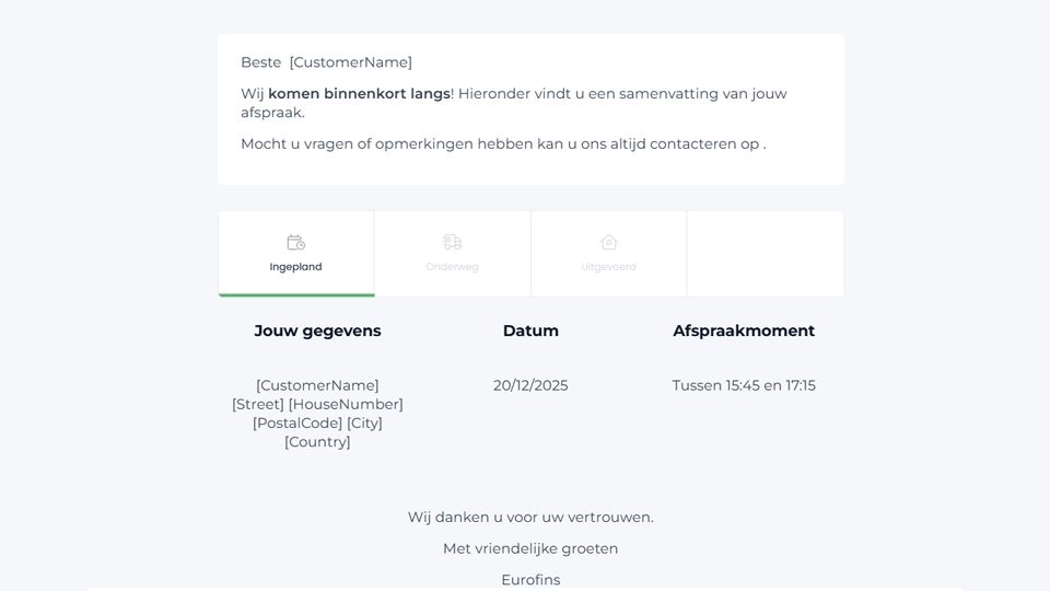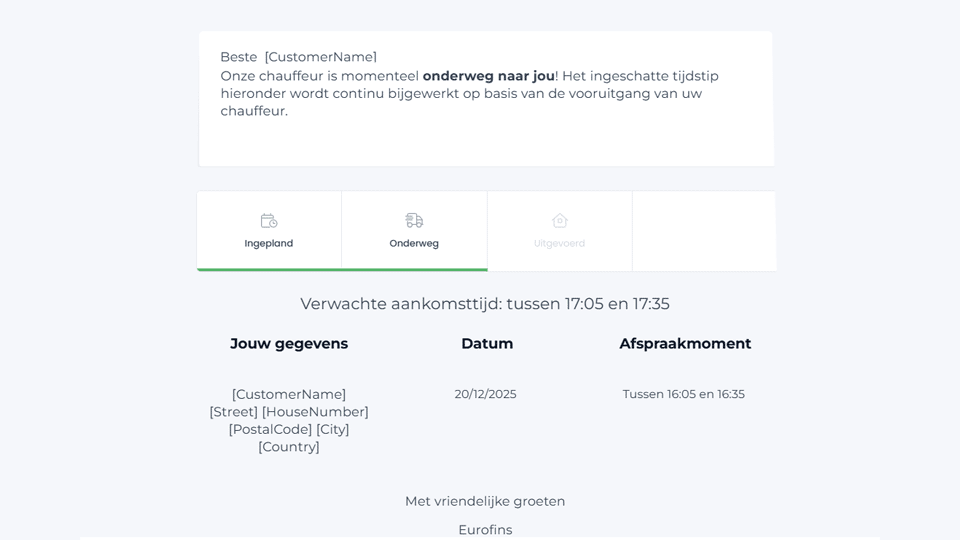 Je krijgt een aangepaste automatische mail zodra de planning voor de volgende dag bekend is. In deze mail vind je een tijdsindicatie van het voorziene afhaalmoment.